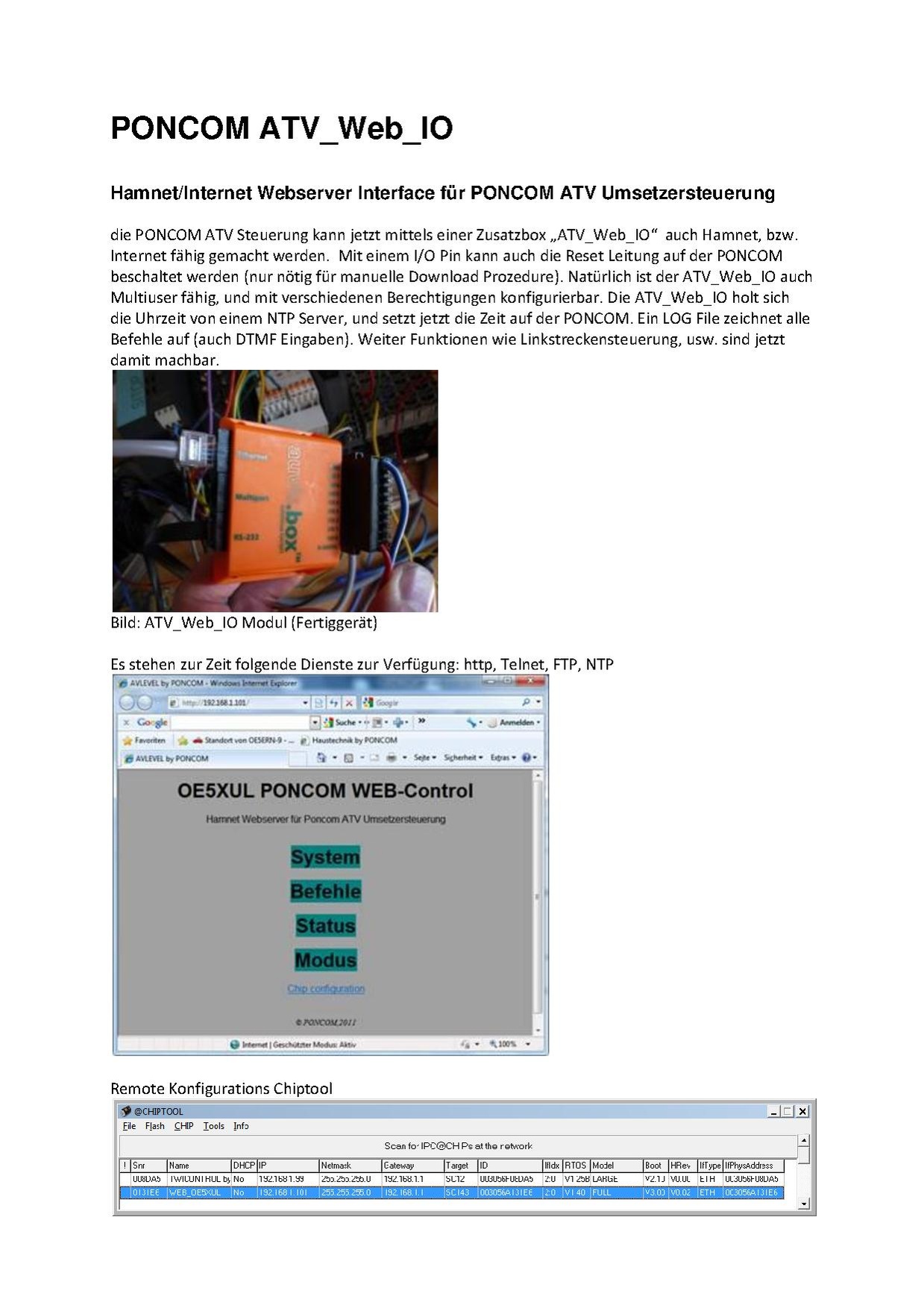 die PONCOM ATV Steuerung kann jetzt mittels einer Zusatzbox „ATV_WEB_IO“ auch Hamnet-, bzw. Internet-fähig gemacht werden. Es stehen zur Zeit folgende Dienste zur Verfügung: http, Telnet, FTP, NTP