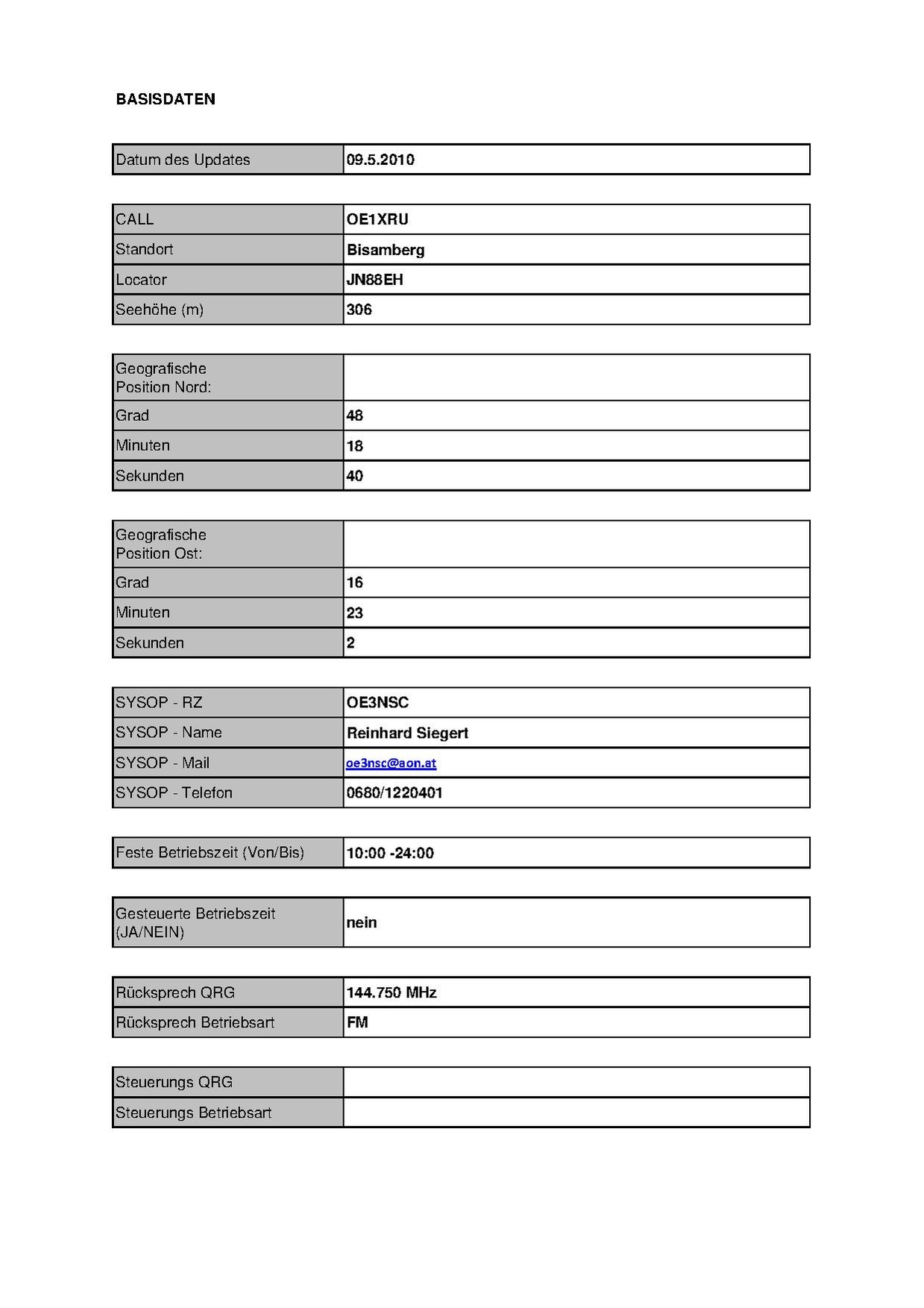 Kenndaten Stand September 2010 OE1XRU Bisamberg 144.750 MHz Sysop: Reinhard OE3NSC Userausgabe: DVB-S 1280 MHz Vertikal SR 16000 DTMF: 99 Befehlsliste 98 Weitere Befehle 91-97 Hilfeseiten Quadrant: LO Link OE3XOS RO Kamera Bisamberg LU Testbild