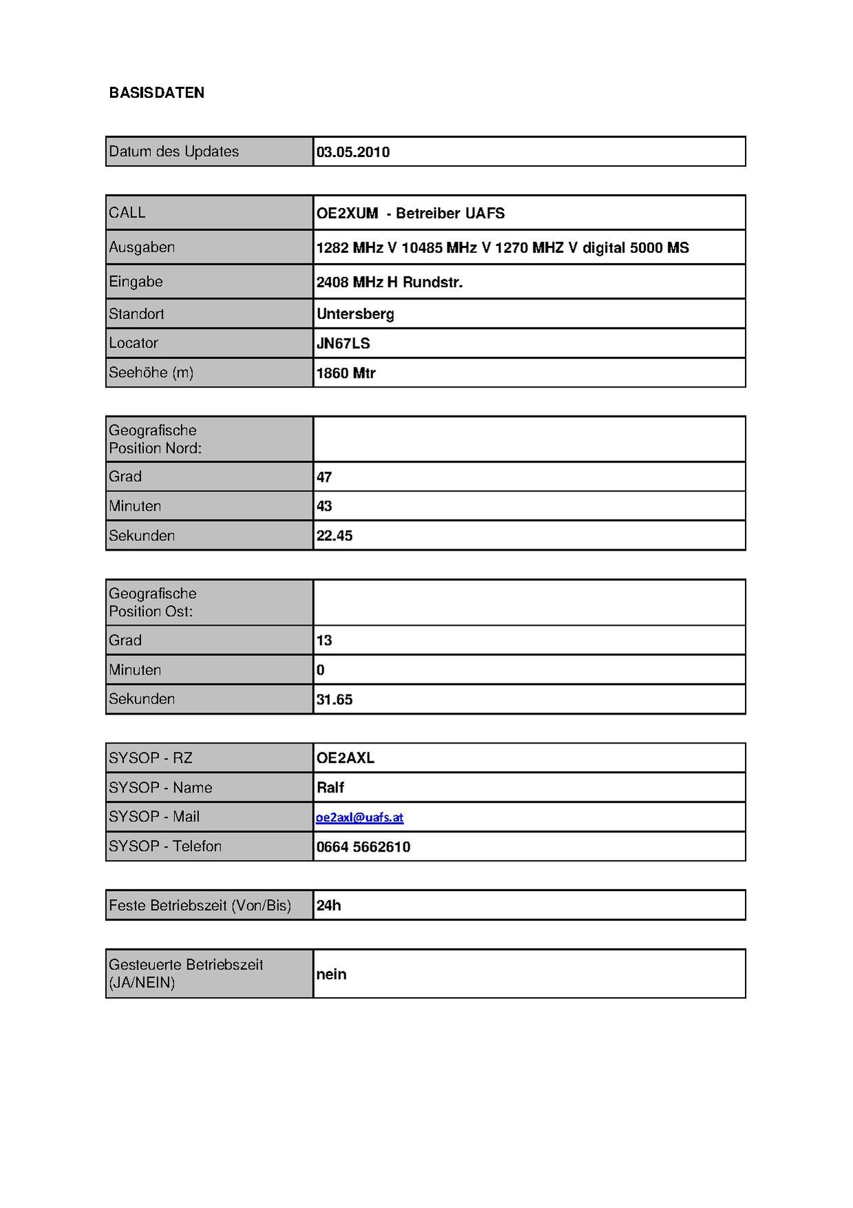 Kenndaten Stand Mai 2010